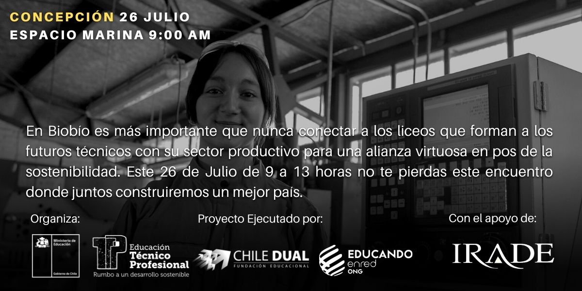 El 26 de Julio en Espacio Marina, Talcahuano, el Ministerio de Educación junto a ONG Educando en Red y Fundación Chile Dual, y con el apoyo de IRADE realizarán un encuentro entre liceos técnicos de la región y empresas afines para encontrar maneras inteligentes de vincularse con sus territorios y hacer un aporte al desarrollo del país.
